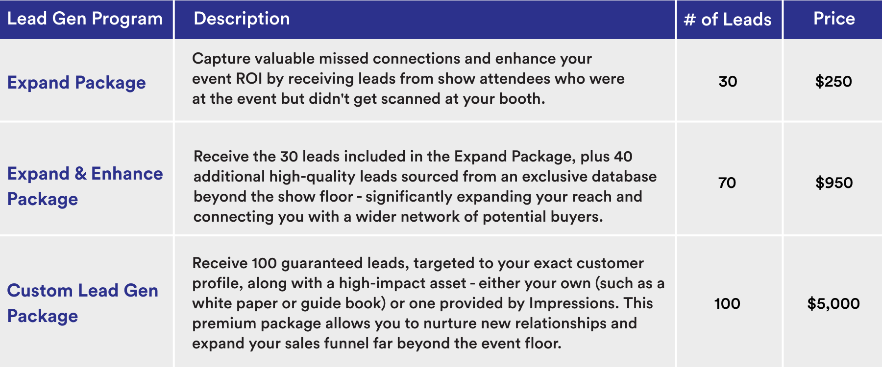 - Expand Lead Package ($250 / $8 CPL) – guarantees 30 leads that you did not meet with on the show floor.